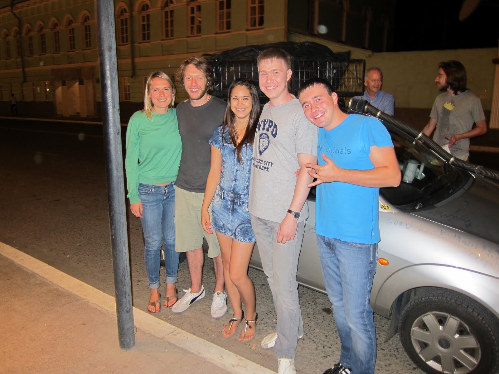 We dropped our bags and headed out to get some food and drinks. Not too far from the hotel was a place called Cum Cum (we're not kidding) - it was packed with locals so we ventured in. As the beers arrived, a bear of a man named, Morat, marched over and put his hand on Matt's chest and started speaking in Russian. None of us could understand him but he kept saying something that sounded like "Uma Thurman". After a while we were finally able to figure out that Morat thought that Matt was a famous Russian rock star. After that he pulled up a chair and kept calling Matt, Vladimir Kristofski. The whole restaurant was in on the joke and before long we were the new hit of the town - these crazy kids that were driving to Mongolia.